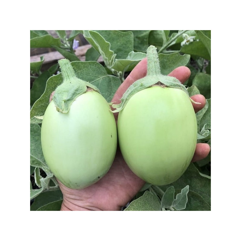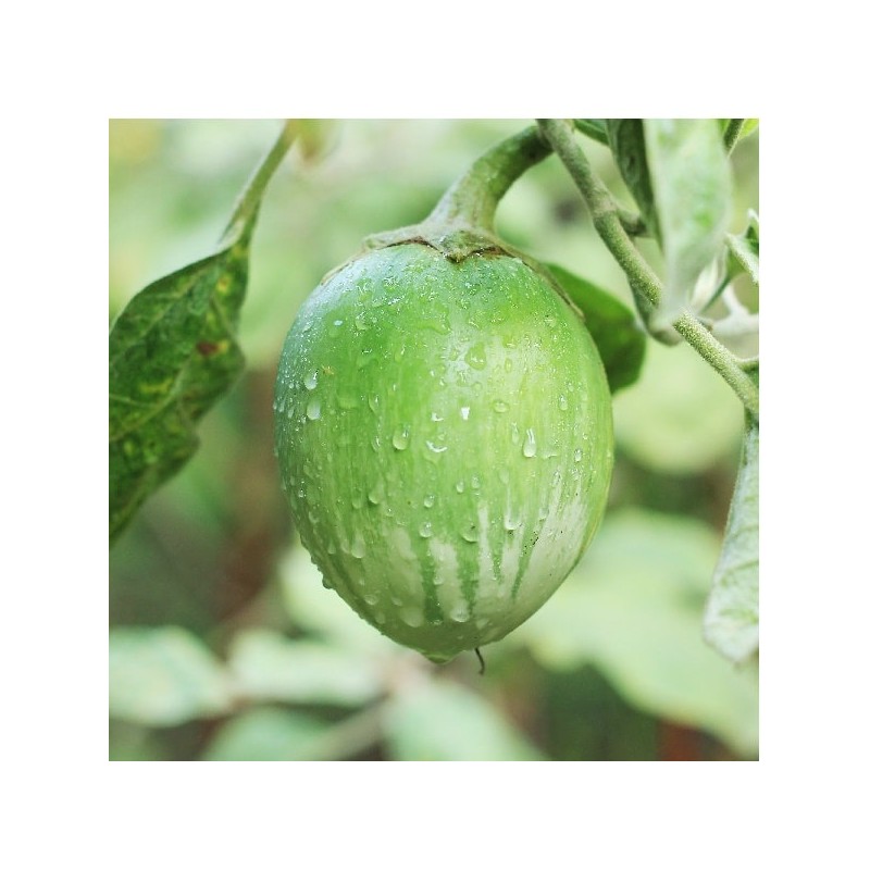L'aubergine Apple green est une variété précoce au port compact, peu commune, qui produit des fruits vert pâle, de forme ovoïde de +/- 6 à 8cm de diamètre (150 grammes environ) à la peau très fine. Chair blanche tendre à la saveur douce.