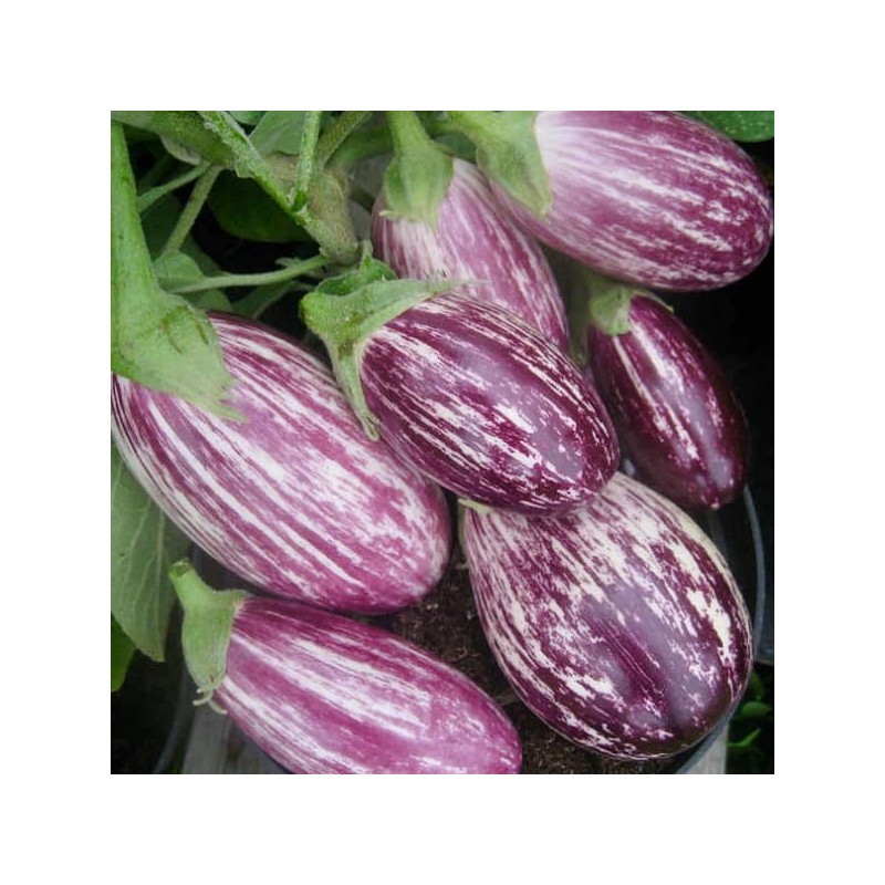L'aubergine Pandora striped rose est une variété qui produit des aubergines ovales couleur lilas ou rosé couvertes de rayures crème, mesurant environ 15 centimètres. Collet vert tendre sans épine La chair blanc crème est tendre et ne présente aucune amertume.