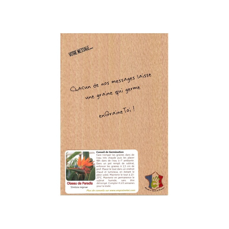 Imprimée sur une feuille de bois, la Carte à Graines est une carte originale dotée d'une capsule qui contient des graines à offrir.
