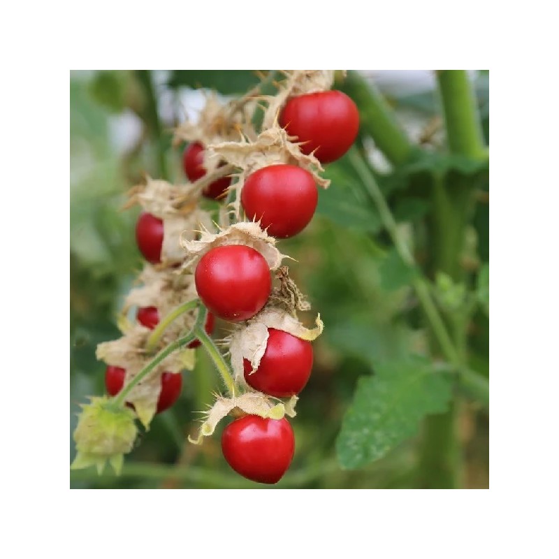 La tomate Litchi également connue sous le nom de Morelle de Balbis est un légume-fruit original originaire d'Amérique du Sud. Cette variété produit des fruits enveloppés dans des bogues épineuses. Ils ressemblent à des tomates cerises rouges de 1 à 2 cm. Saveur sucrée et acidulée, entre la cerise, le litchi et la tomate.