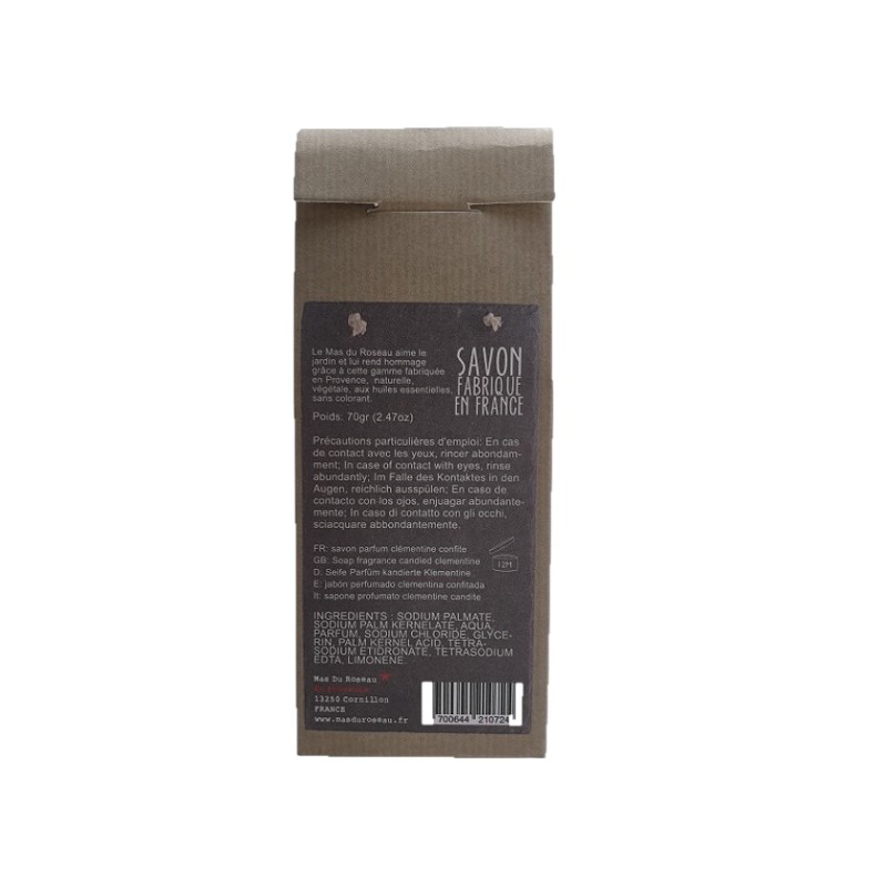 Le Savon 100% jardin Clémentine confite nettoie et adoucit les mains pour les parfumer d'une senteur gourmande de clémentine confite. Il est signé la Savonnerie Le Mas du Roseau.